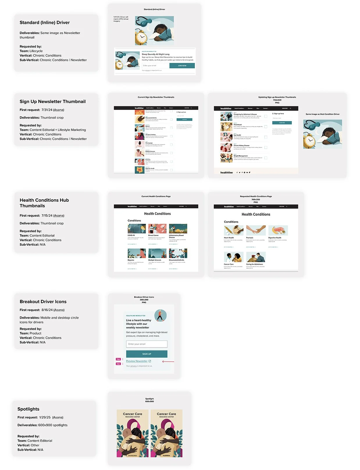 I developed a comprehensive Figma map organized by 24+ health conditions, breaking down each request into categories such as newsletter banners, social posts, pathing tiles, and drivers. This shared, transparent file allowed all stakeholders to easily track existing assets, identify gaps or overlaps across teams, and streamline the design process. It also served as a blueprint for other designers, providing clear expectations and guidance for projects related to the Care Journeys.